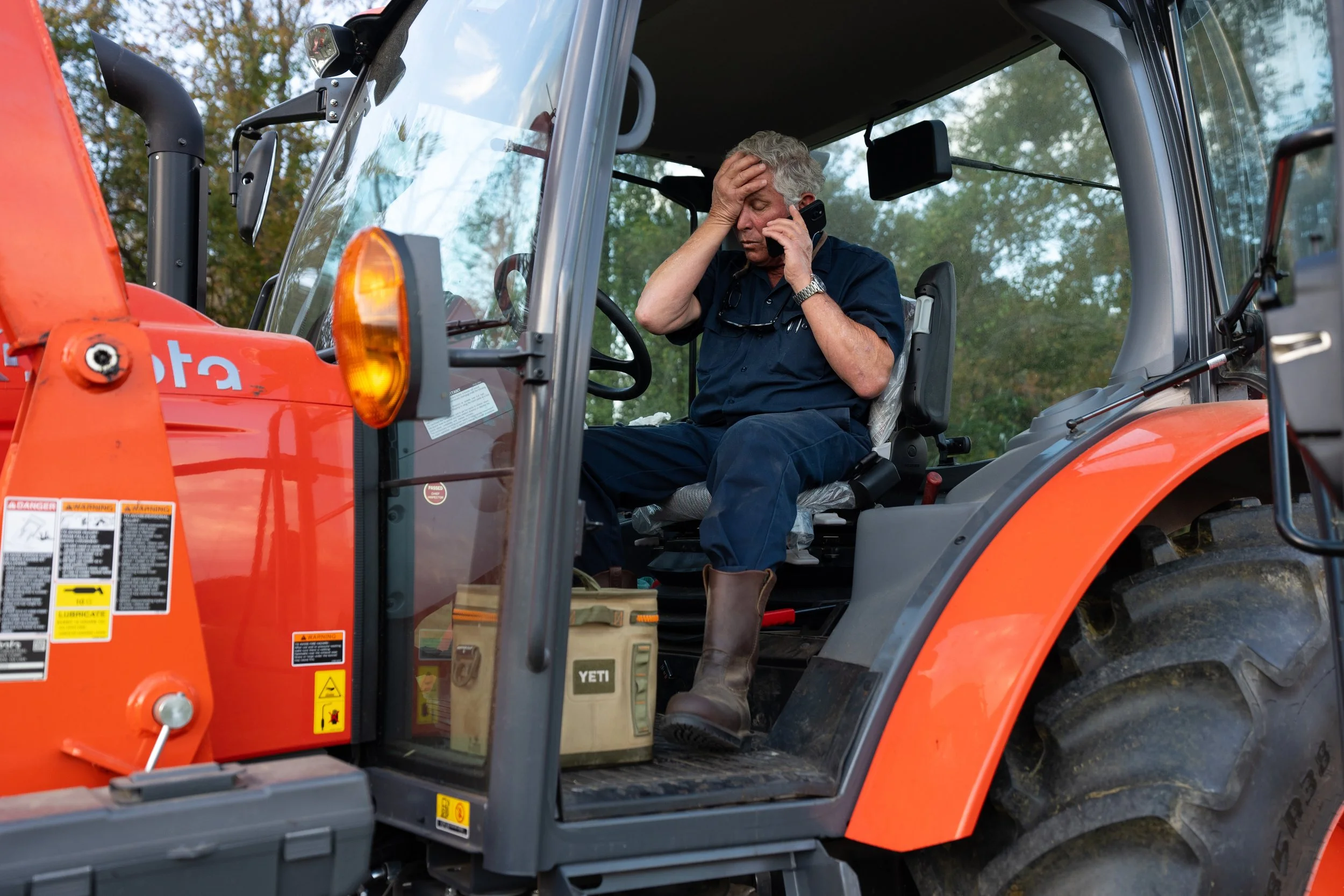 Mike sits in his tractor while answering an emergency call from a client whose dog had eaten rat poison. When not working at the practice, he spends his time on his farm taking care of his cows and driving his tractor as a means to unwind from the stresses of the day. “One things about being in a tractor, it makes you think… I like farming because it allows me to relax and unwind.”