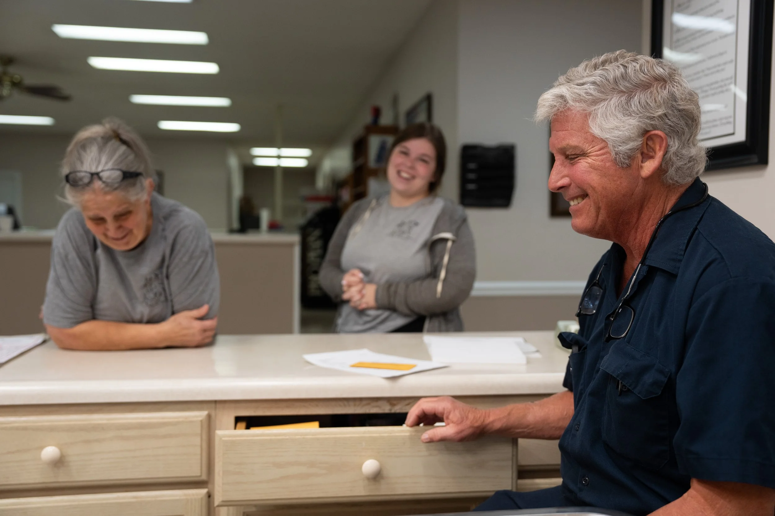(Left to right) Vet assistants, Kim Williams and Maggie Powers laugh at Mike “Doc” Culver as he cracks jokes at his clinic in Williamsburg, KY on Oct. 26, 2024.