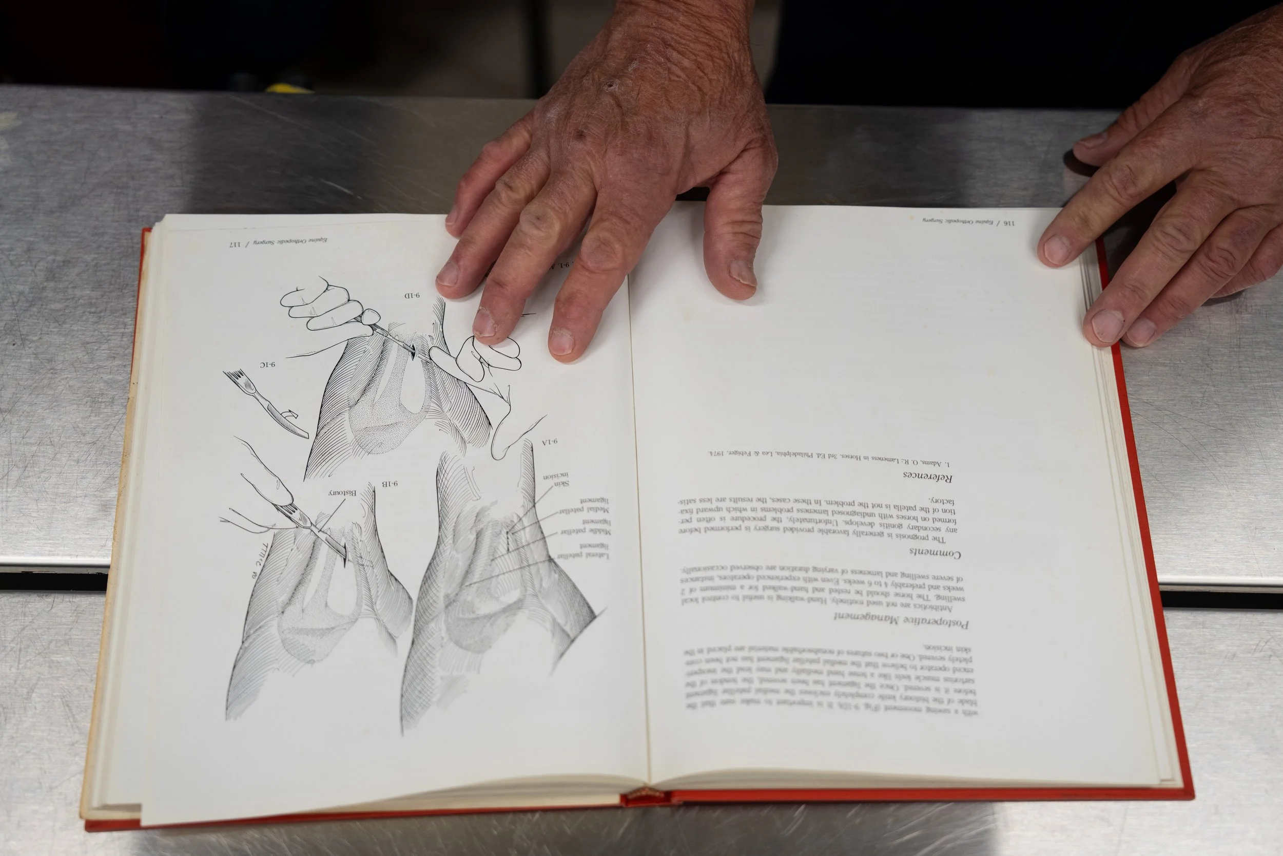 Old medical books prove a useful to research tool. Mike looks up medial patellar ligament desmotomy (MPD), a surgical procedure that corrects upward fixation of the patella.