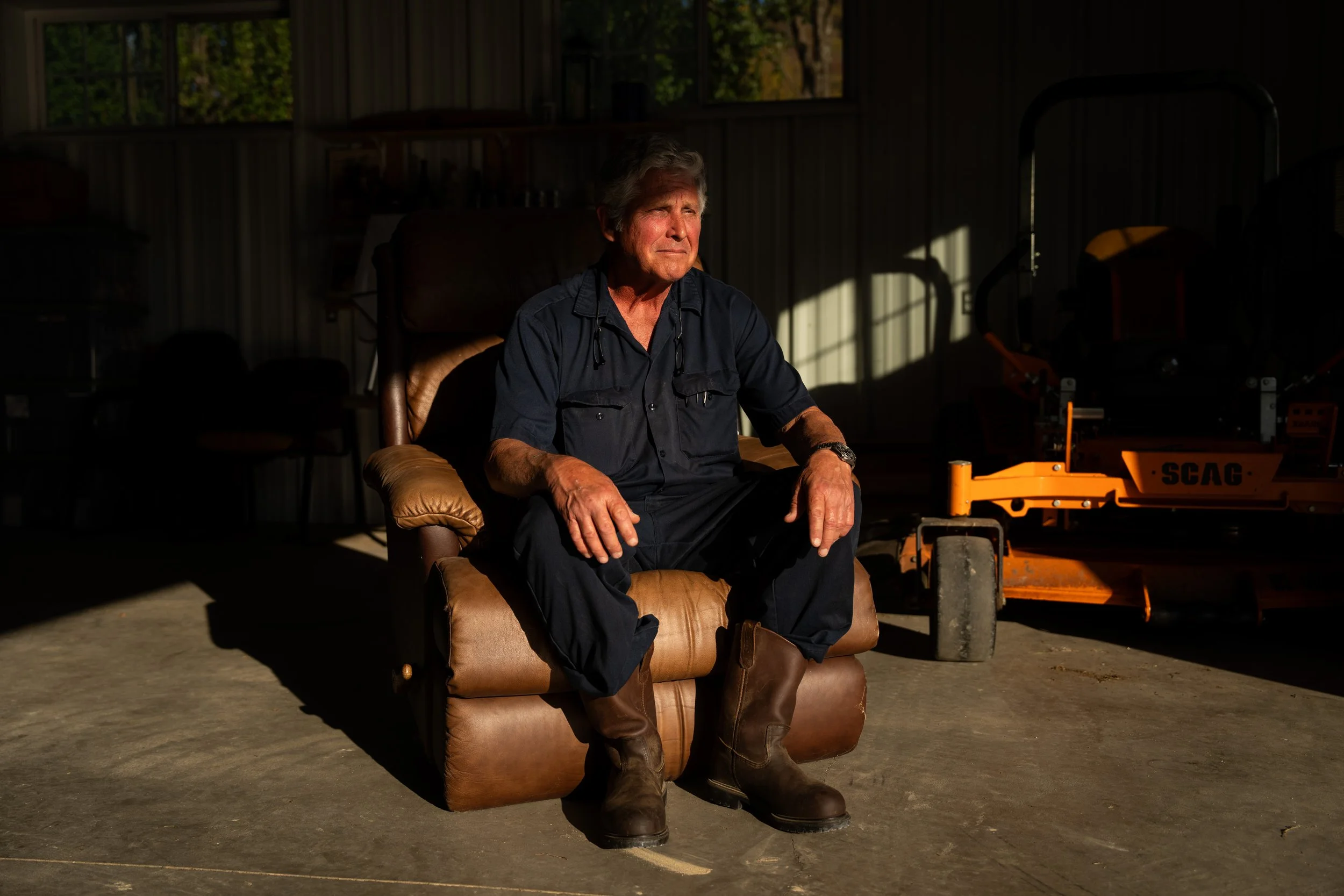 Mike looks towards his cows grazing while sitting inside of the garage dedicated to his father. He has been raising cows as a hobby since his grandmother introduced them to him. "I'd be better off selling every damn one of them," he jokes, "but I just like keeping them."