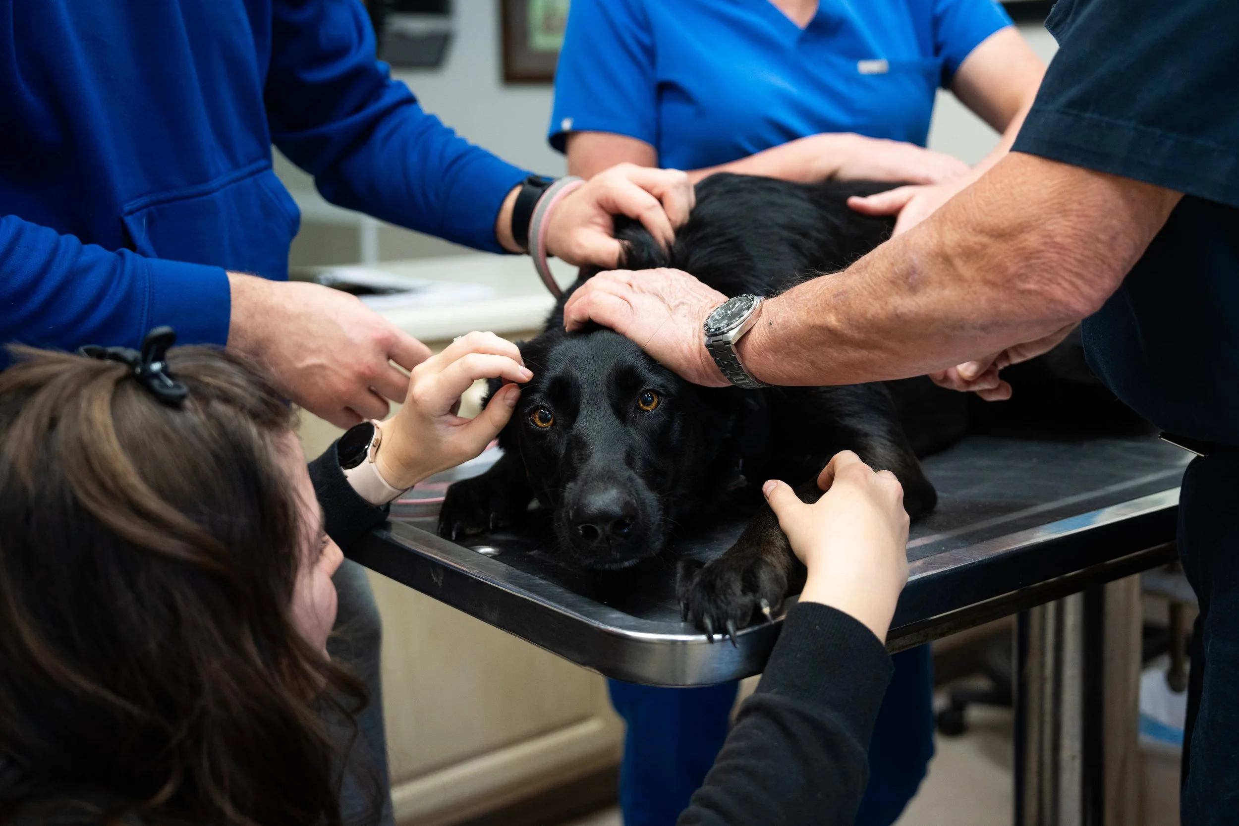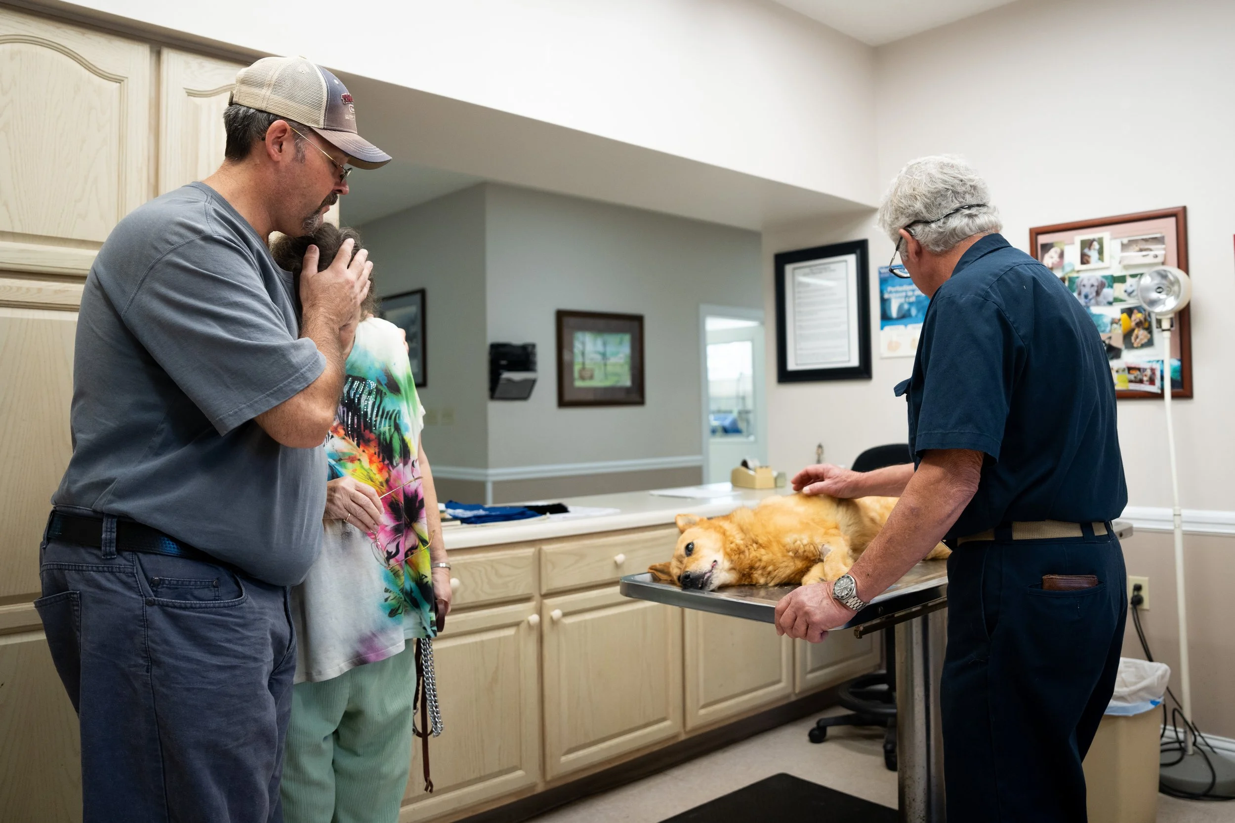 Ada and Glen Hall pet their dog, Ellie, while Mike gives her a shot. Glen's family has been coming to the clinic to bring pets for years. “We’ve brought 20 of our dogs through here,” he says.