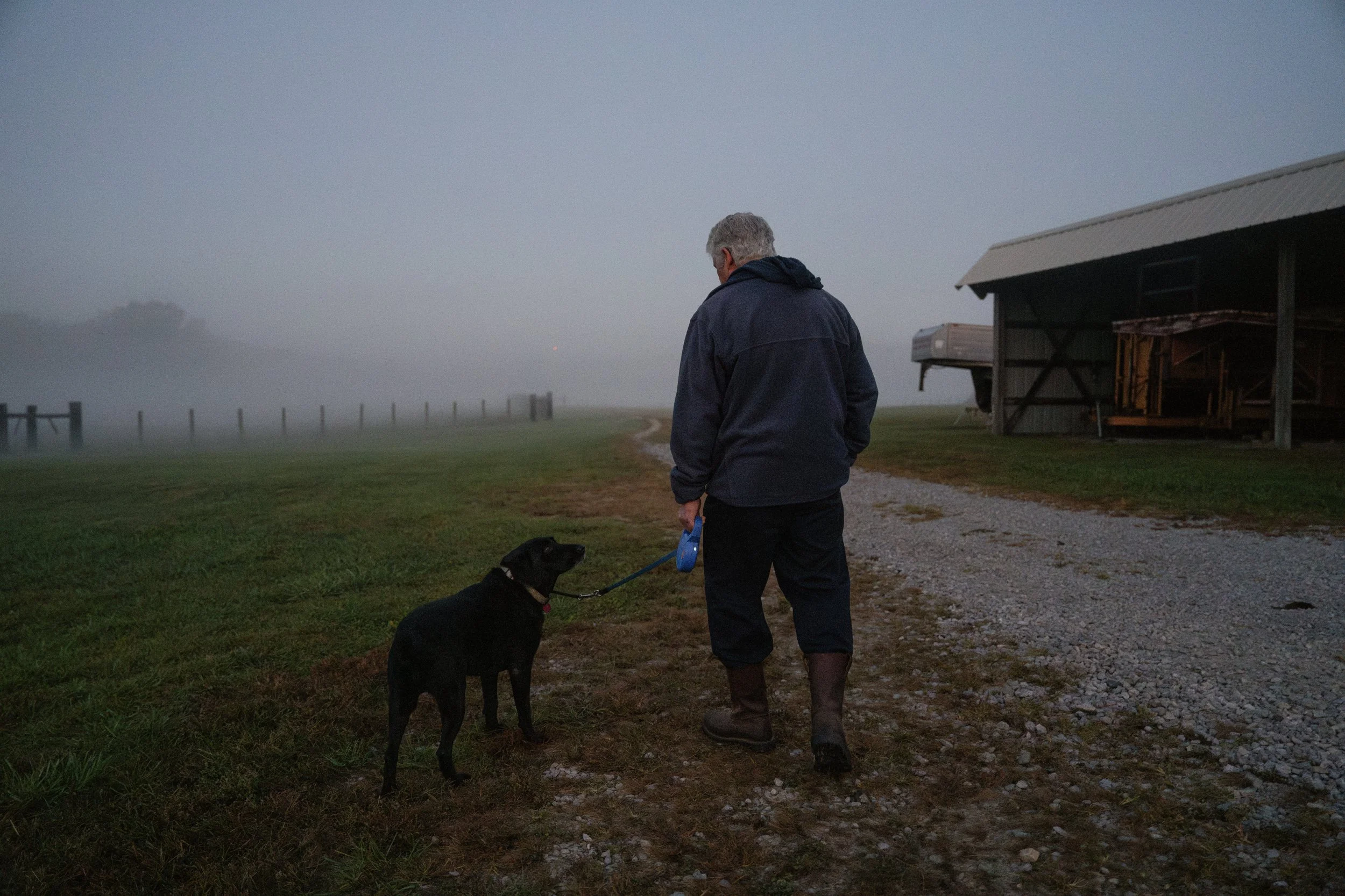 Mike “Doc” Culver walks Josie in the early morning on his 150 acre farm that has been in his family for the past five generations. Josie was staying at Culver's veterinary clinic while her owners were away.